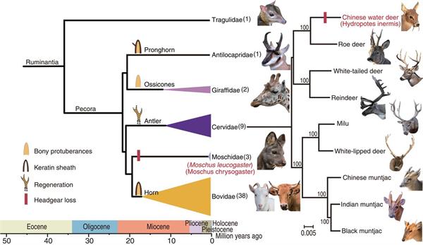 牛、羊、鹿同属反刍动物有角下目,是唯一现存的具有骨质化头部附属物的一群哺乳动物。草食动物大多没有尖牙利爪,角既是它们面对捕猎者的自卫武器,也是同类间争夺配偶和领地的主要工具。随着草食动物舍饲水平的不断提高,角越来越不利于动物生产和管理,而且有极大的安全隐患,在育种上已经将选育无角的牛羊品种作为一项重要的育种目标。美国育种公司利用基因编辑技术,培育了无角的黑白花奶牛,免去了小牛出生后被烙去牛角的痛苦;通过基因编辑培育无角绵羊和山羊的工作正在进行,目前尚未成功。因此认识角的起源发生的遗传学基础以及决定有角无角的基因对于培育无角反刍动物新品种具有重要意义。