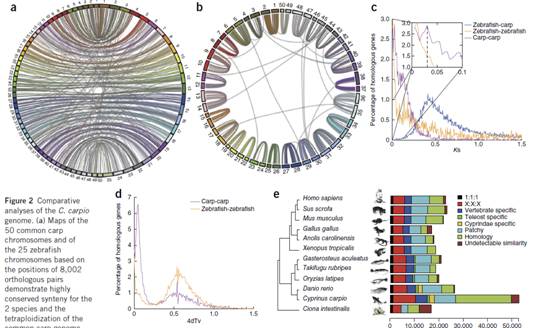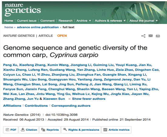 由中国水产科学研究院首席科学家孙效文研究员牵头,中国水产科学研究院联合黑龙江水产研究所、中科院基因组研究所、哈佛大学、奥本大学等单位组建的国际合作研究团队,完成了鲤鱼全基因组序列图谱绘制,成为国际上首个完成全面解析的异源四倍体硬骨鱼类基因组图谱。该研究成果以Article形式于2014年9月21日在国际生物学权威期刊《自然-遗传学》(Nature Genetics)杂志在线发表(DOI 10.1038/ng.3098)。