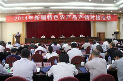 2014年9月1日上午,在第四届中国—亚欧博览会开幕之际,自治区人民政府和农业部在乌鲁木齐市举办2014年新疆特色农产品产销对接活动。会议旨在畅通新疆特色农产品销售渠道,培育产销链条,搭建我区农产品外销平台,助力新疆农产品外销。国务院参事室特约研究员、中国农产品市场协会会长张玉香、农业部市场与经济信息司司长张合成、全国农业展览馆党委书记、中国农产品市场协会秘书长沈镇昭、自治区党委副秘书长、农办主任代宁祥出席了会议,自治区农业厅厅长艾克拜尔·吾甫尔主持会议,自治区其他相关厅局、全疆各地州市农业局,还有全国部分省市农产品批发市场、新疆农产品龙头企业代表和新闻媒体代表约200余人参加了会议。